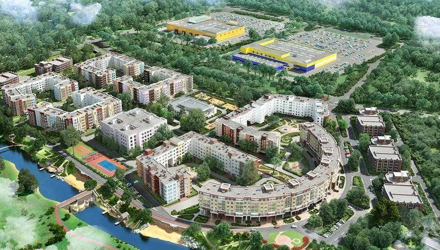 Комплекс занимает 17 гектаров, предлагая жильцам просторные дворовые территории и удобную планировку.